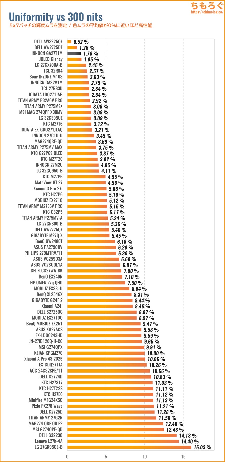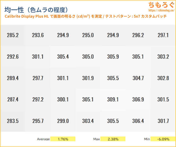 色ムラ(輝度ムラ)の測定結果は平均値でたったの1.8%です。