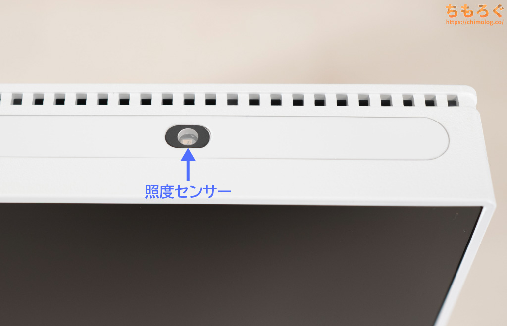 画面上部の右側に、周囲の明るさを検知する「照度センサー」を内蔵します。天井から入ってくる明るさを検知して、画面の明るさを自動的に調整する機能です。