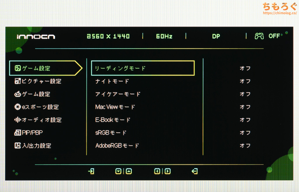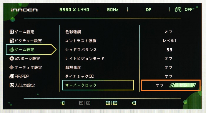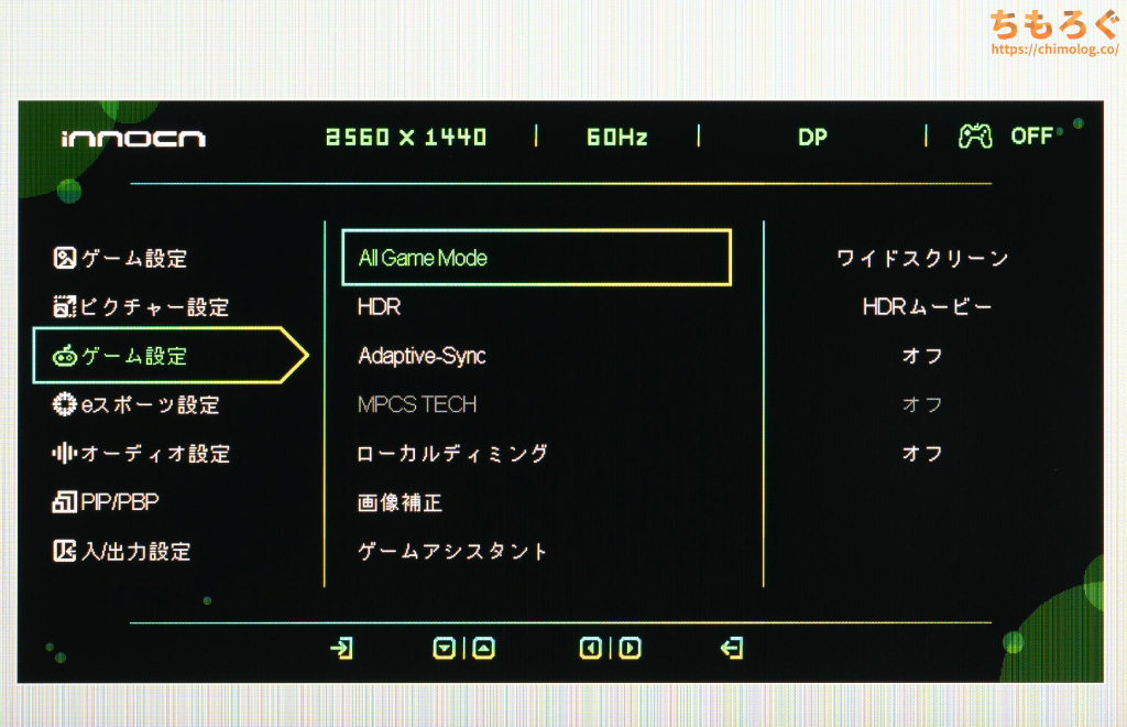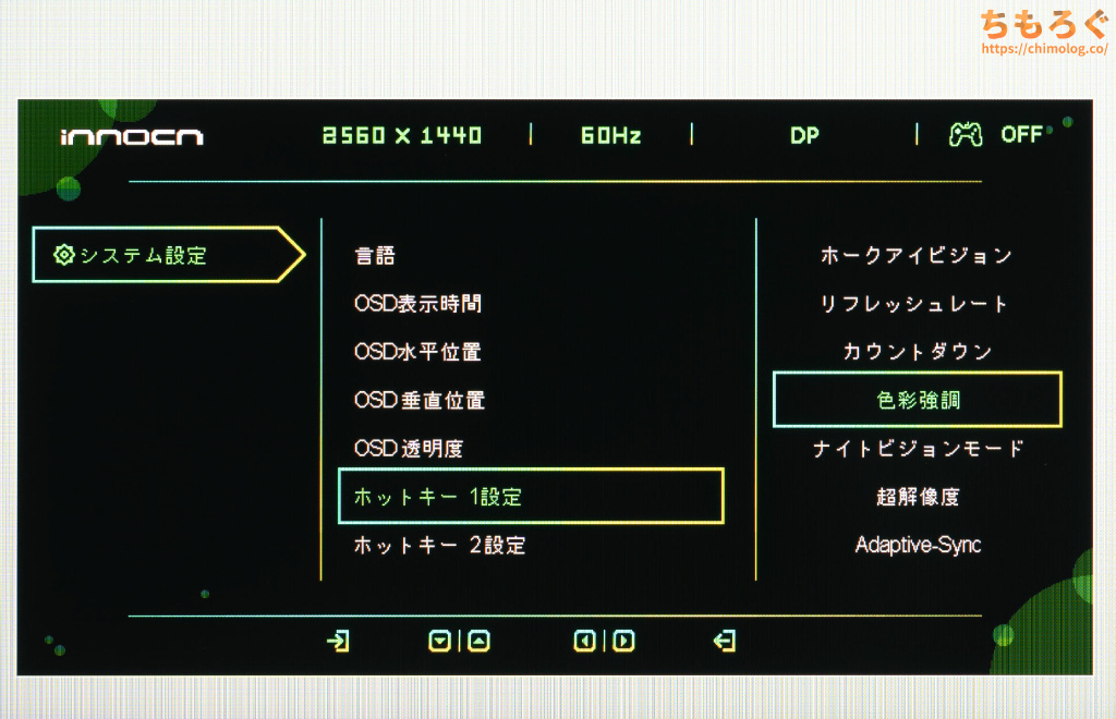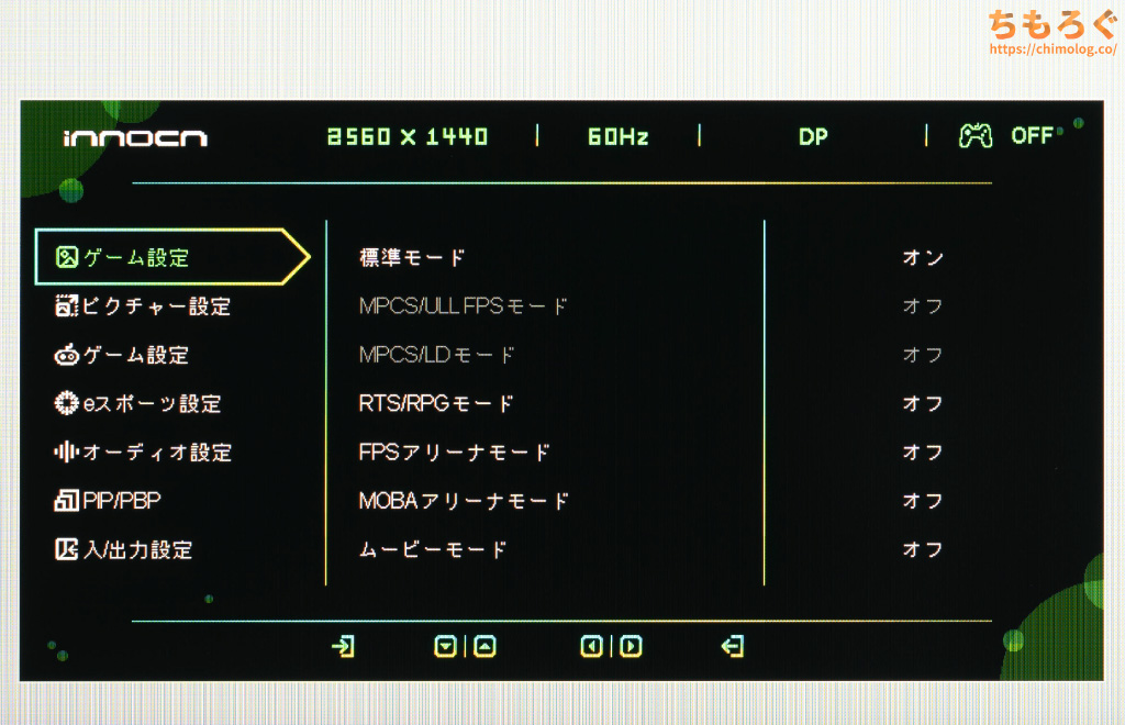 モニター本体の右側裏面にある「5方向ボタン」を使って、OSD設定を操作できます。ちょっと位置が高くて面倒なので、もう少し低い位置が良かったです。