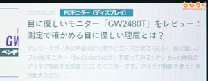 | 一般的なオフィスワーク 文字がそれなりにクッキリと見え、完全なフリッカーフリーに対応。透過性の高いノングレア加工も評価点。「sRGB」モードもそこそこ合っていて、そのまま使えます。 | |