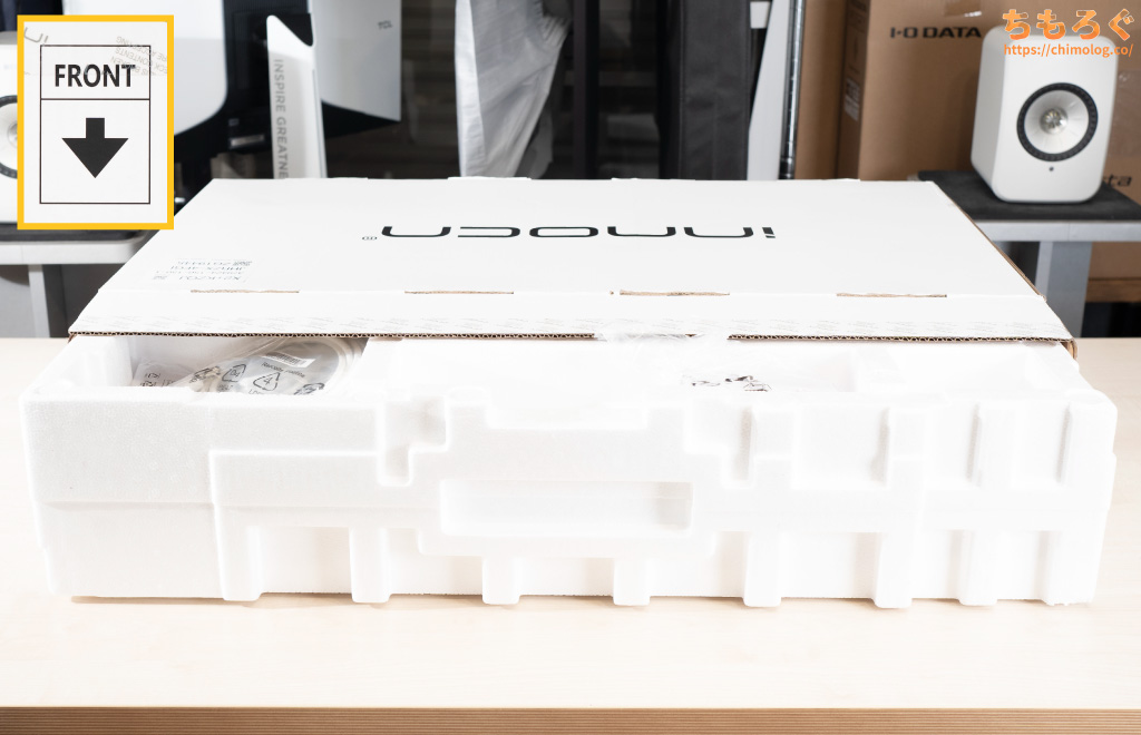 箱に書いてある「FRONT」のロゴを床に向けてから開封して、梱包材まるごと全部引っ張り出します。