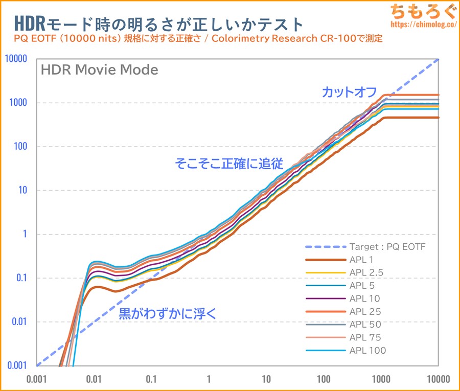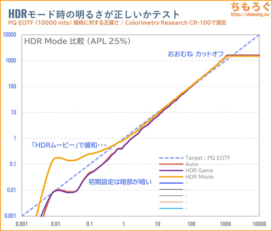 | HDRコンテンツの再現性 Display HDR 1000認証を軽々と合格できる強力なHDR性能です。Mini LEDモニターとして非常に明るく、輝度の安定性も優秀。ただし、ライバル機と比較して精度(PQ EOTF)が悪く、コントラスト比が伸びにくいです。それでも明暗差のあるHDRを表示でき、おおむねHDRコンテンツの再現性が高いです。 |
