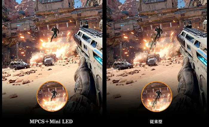 素の性能が平均的なIPSパネル(約1100:1)をわずかに上回り、Mini LED(1152分割)を使った「部分駆動」がそこそこ効きやすく、約2000~3000:1まで伸ばせます。
