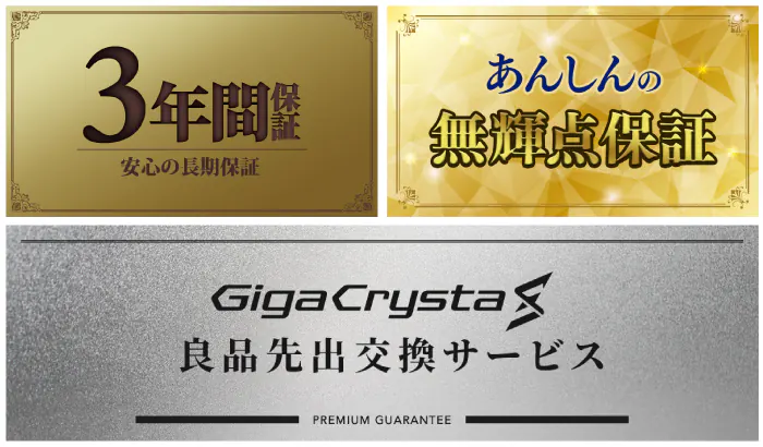 液晶パネルを含む3年保証、1ヶ月以内の無輝点保証(= 光ってるドットを1/3個も許さない)、DELLに匹敵する良品先出交換サービスも対応。
