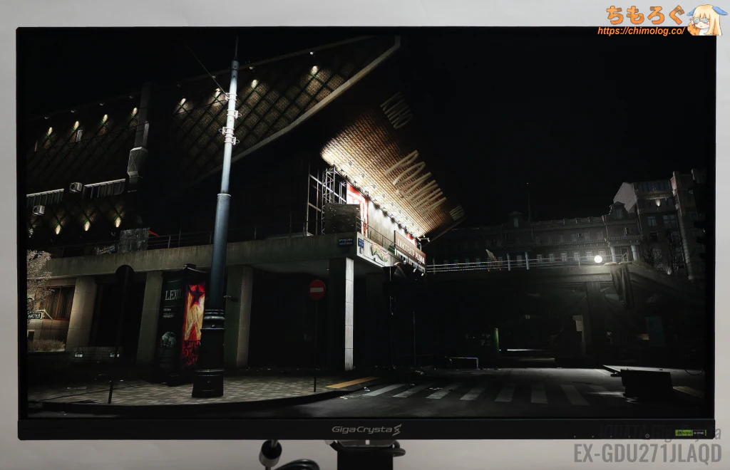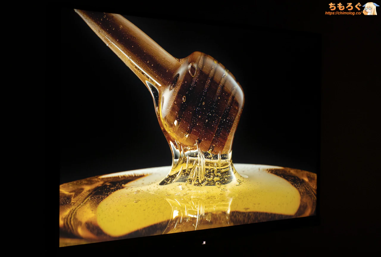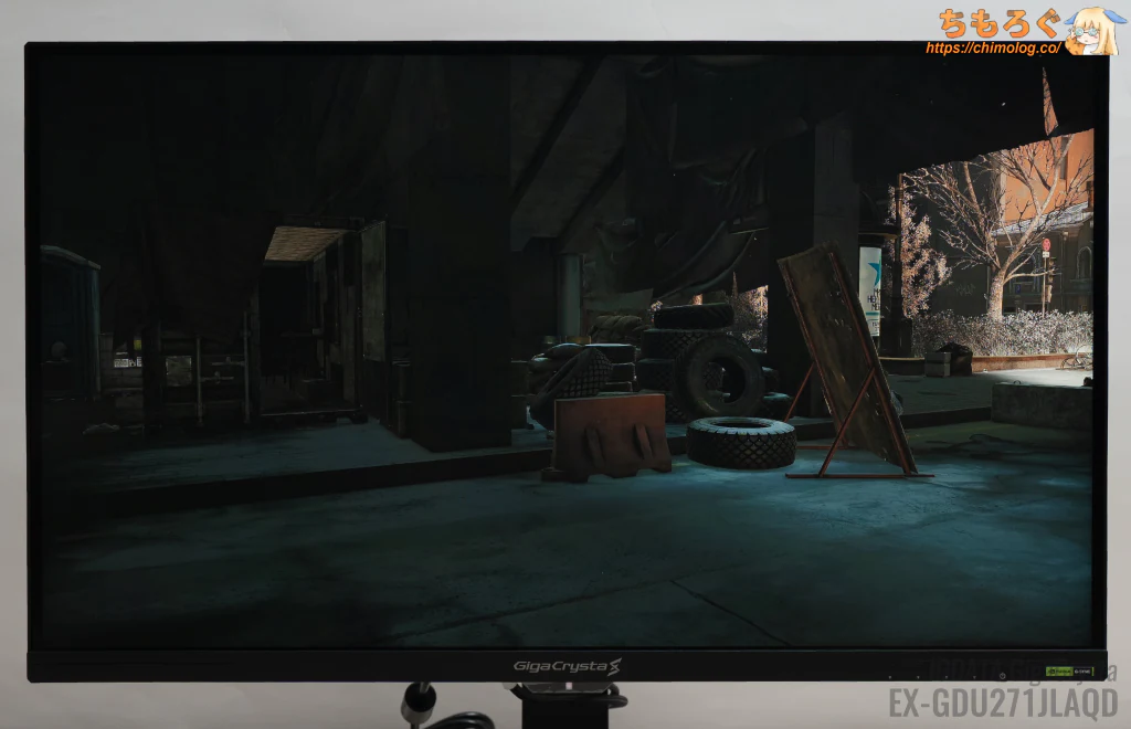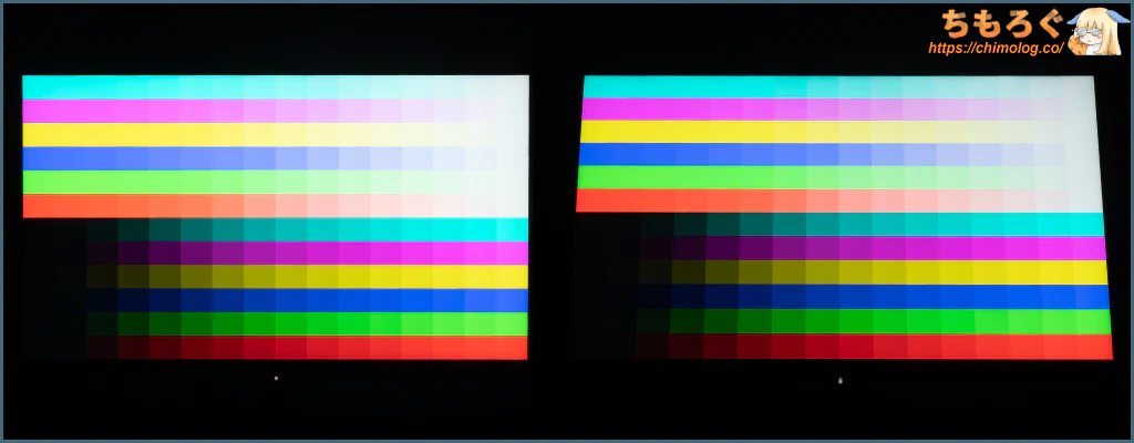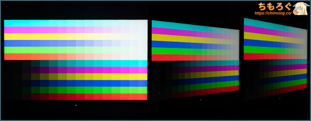 それでも真っ暗な部屋で眺めていると、白浮きしているのが見えます。OLEDパネル並と行かず、ベストケースでVAパネル相当の黒さが限度です。