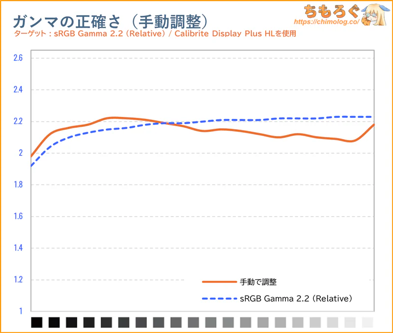 手動調整後のガンマカーブとグレースケール(色温度)グラフです。