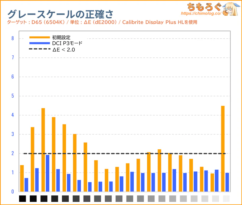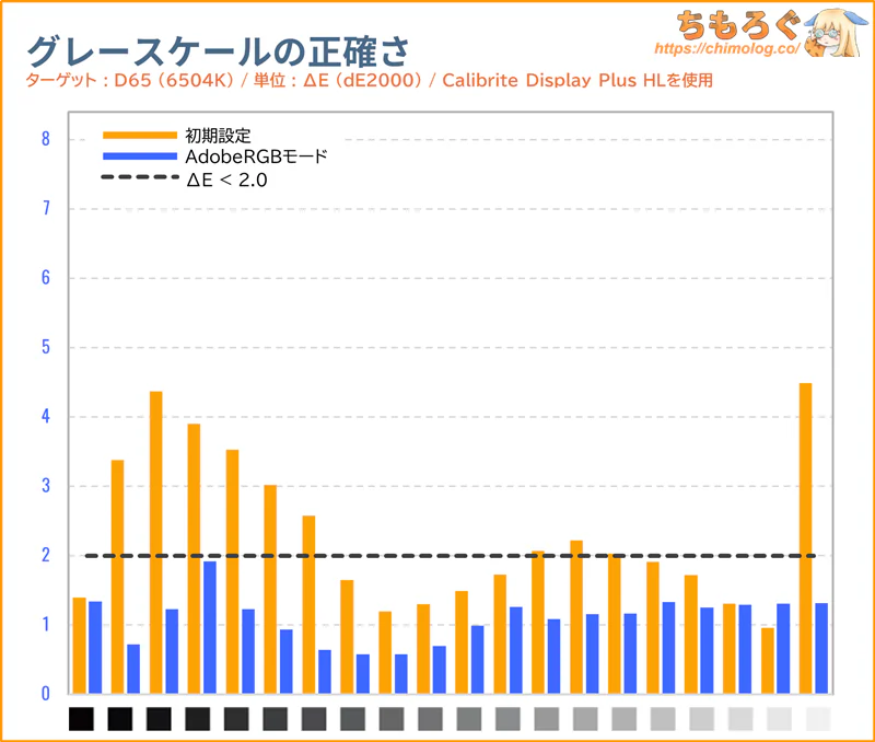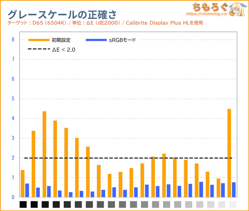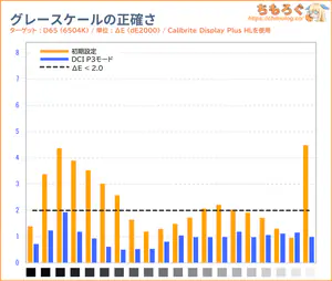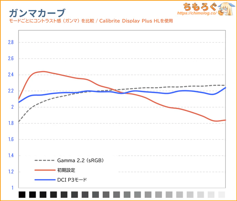 黒つぶれ気味な暗部階調を持ち上げて、同時に白飛び気味な明るい階調を押し下げます。色温度(グレースケール)は少しだけ寒色に偏っていますが、問題ない範囲です。