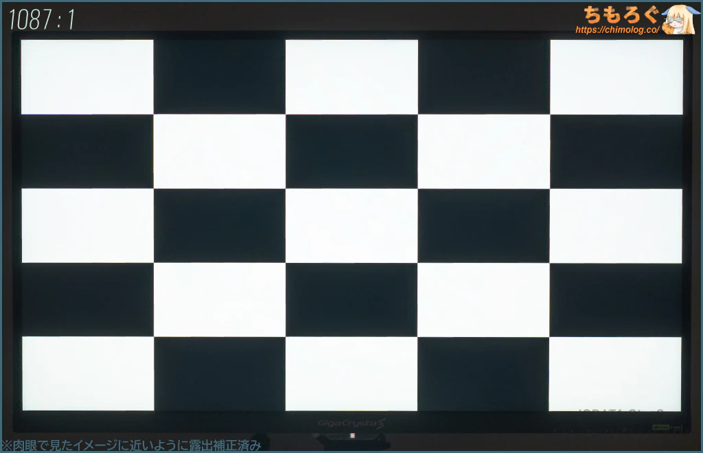 コントラスト比(実測)は1087:1です。設定からローカルディミングを有効化すると、最大4500:1まで伸びます。