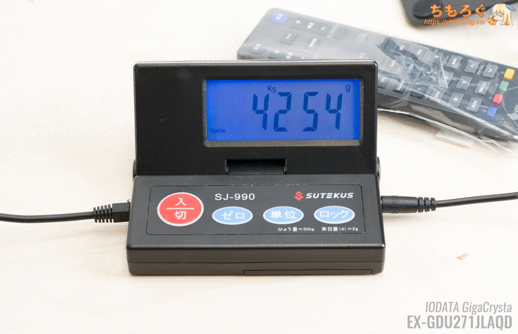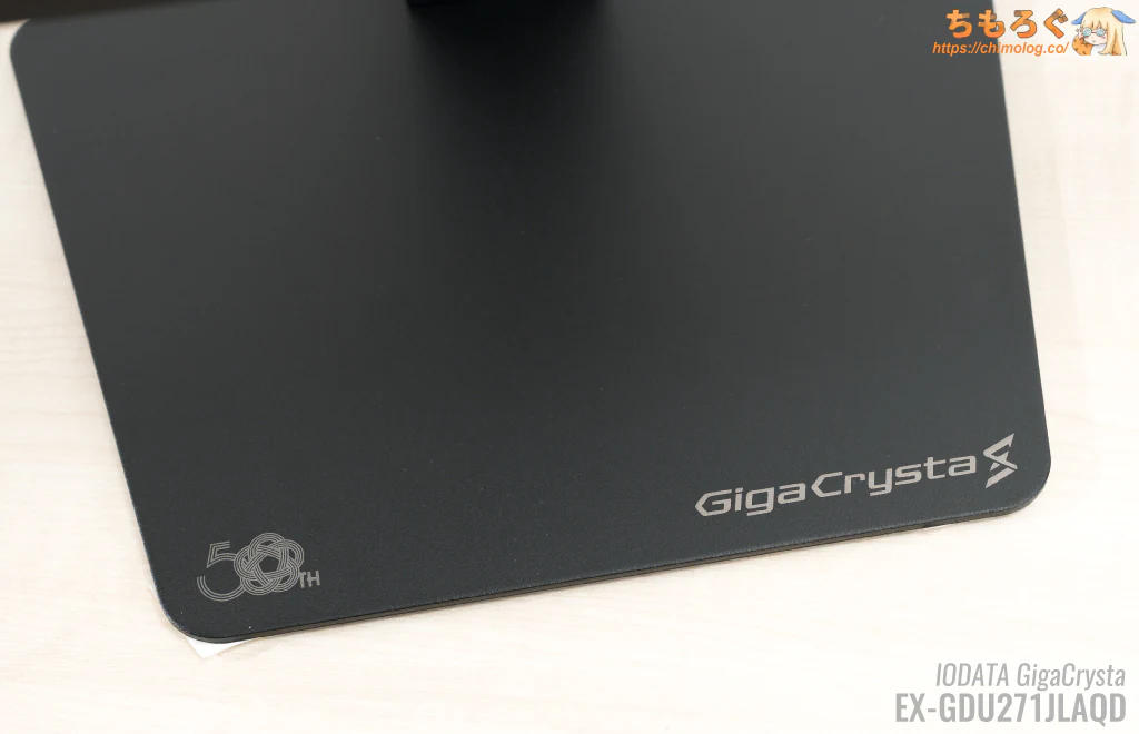 指紋がつきづらい粒子状のザラザラ表面加工が施され、シンプルな「GigaCrysta S」のロゴマークが目を引きます。金属製の重たく頑丈なスタンドに「50周年」を記念するロゴも・・・ちょっとダサい。