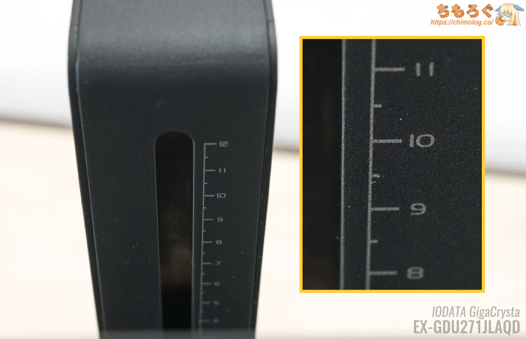 スタンド部分に高さを確認する目盛りが0.5 mm単位で印刷され、ポジションの調整に役立ちます。