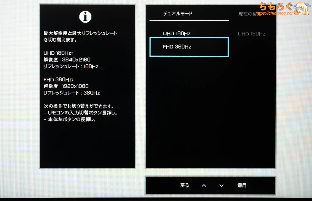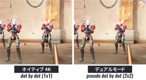FPS向け機能として、ブラウン管テレビのような仕組みで残像感を抑える「DyDs」モードがあり、最大340 Hz(デュアルモード)と合わせて残像感の少ない映像を表示可能。