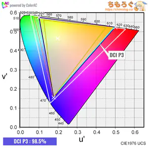 もっとも一般的な規格「sRGB」で約100%をカバー。HDRコンテンツで重要なシネマ向けの規格「DCI P3」は約99%カバーします。