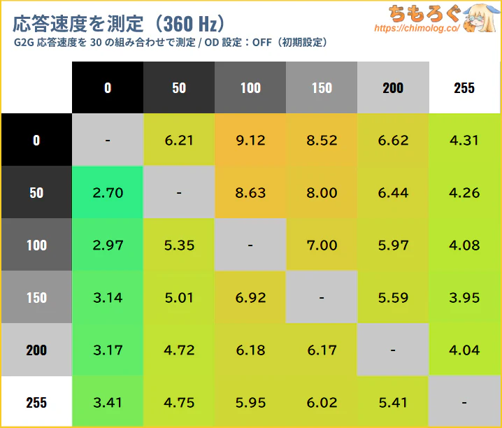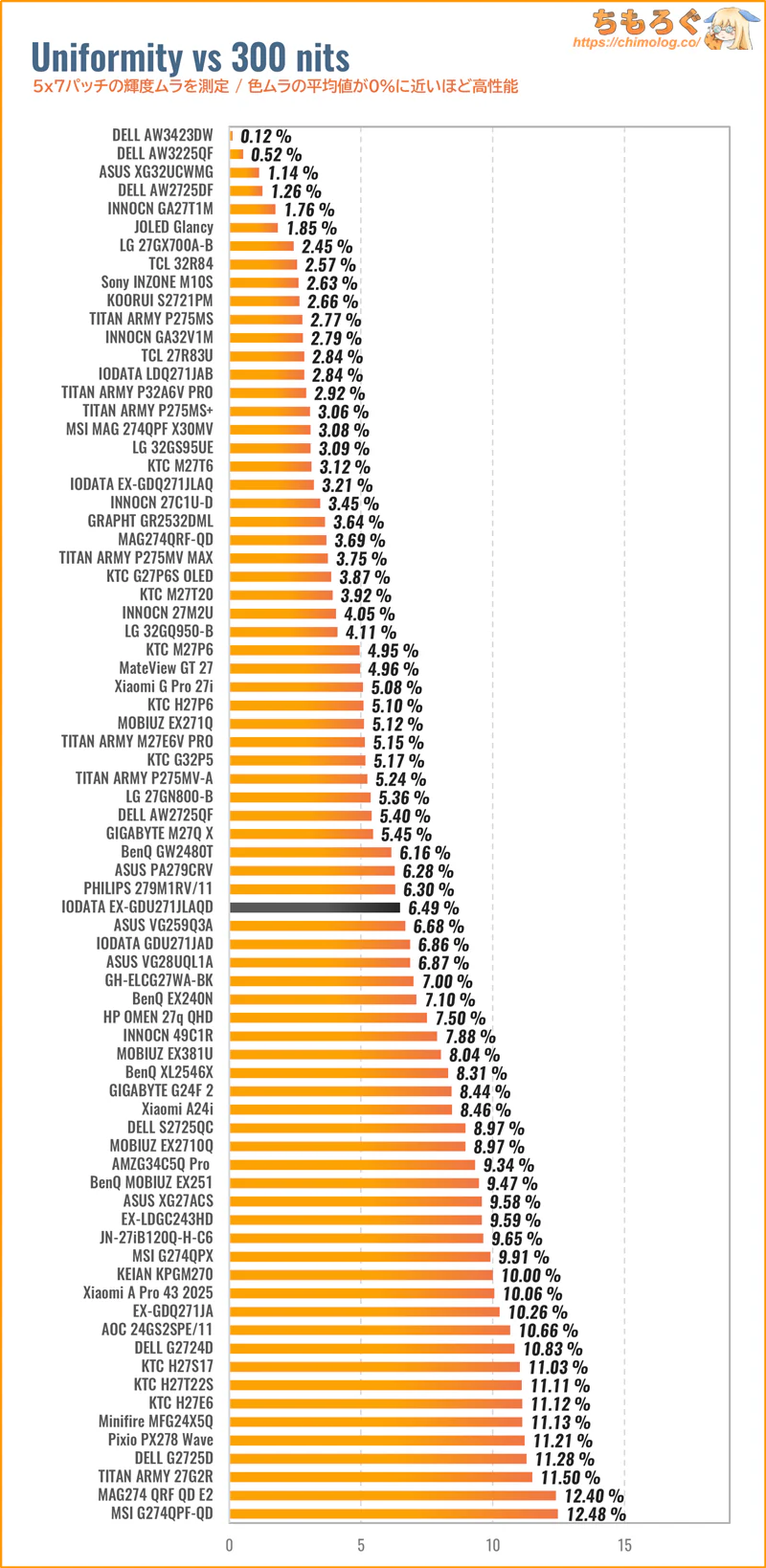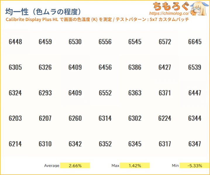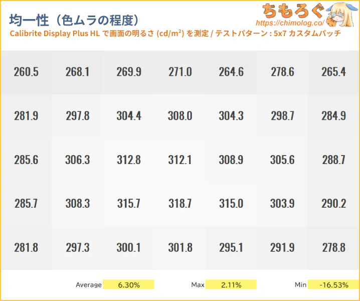 色ムラ(輝度ムラ)の測定結果は平均値で6.5%です。