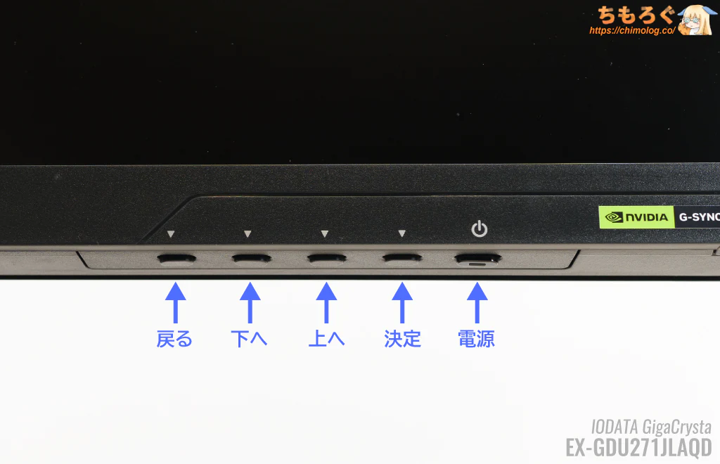 モニター本体の右側底面にある「物理ボタン(5個)」を使って、ちまちまとOSD設定を操作できます。とても面倒くさいです。