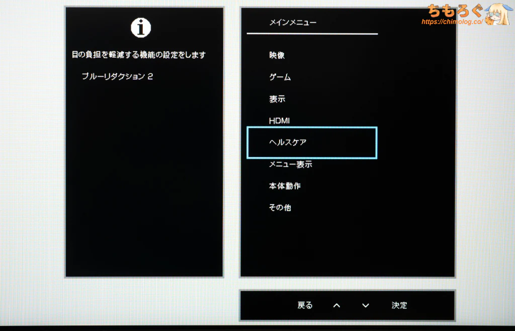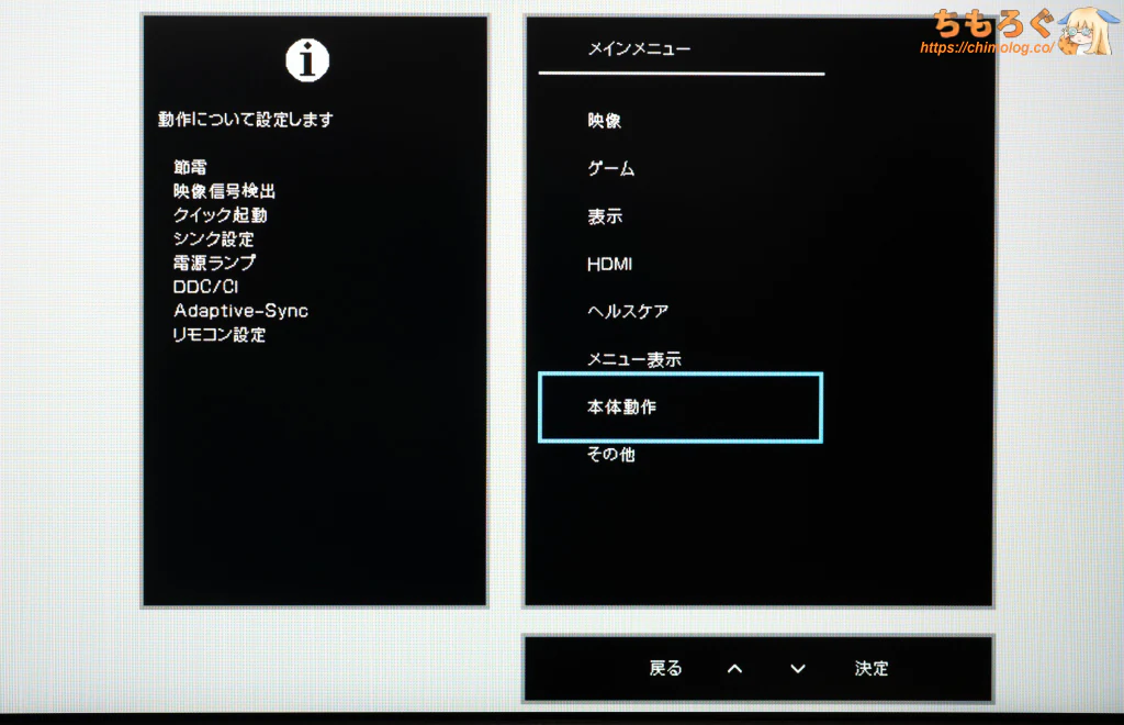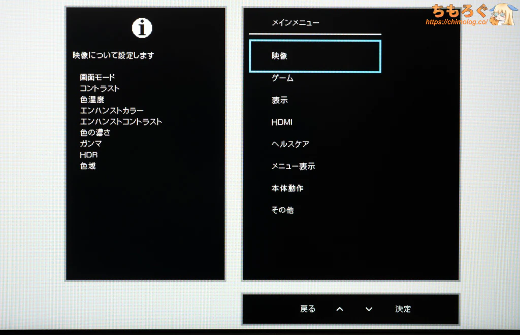 項目ごとに分かりやすく整理されたフォルダ階層型のOSDレイアウトを採用。ボタン操作ならレスポンスも良好です。