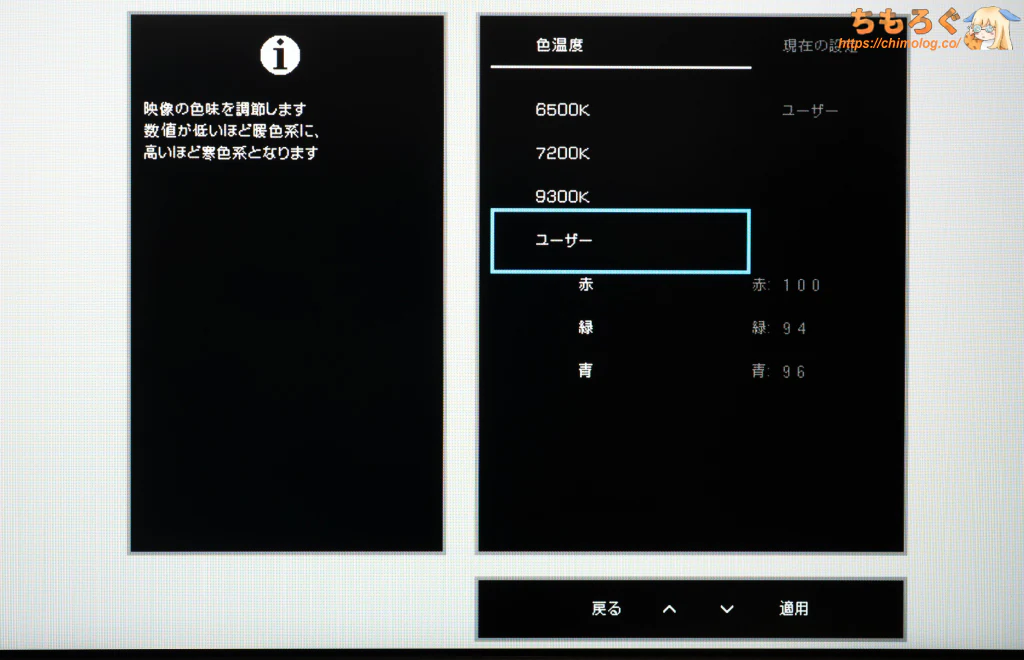 - 色温度:ユーザー