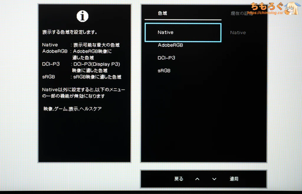 従来モデルと同様に、やはりIODATA GigaCrystaシリーズはややクセが強く、調整の自由度が低いです。