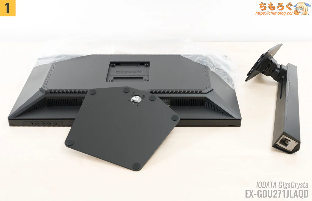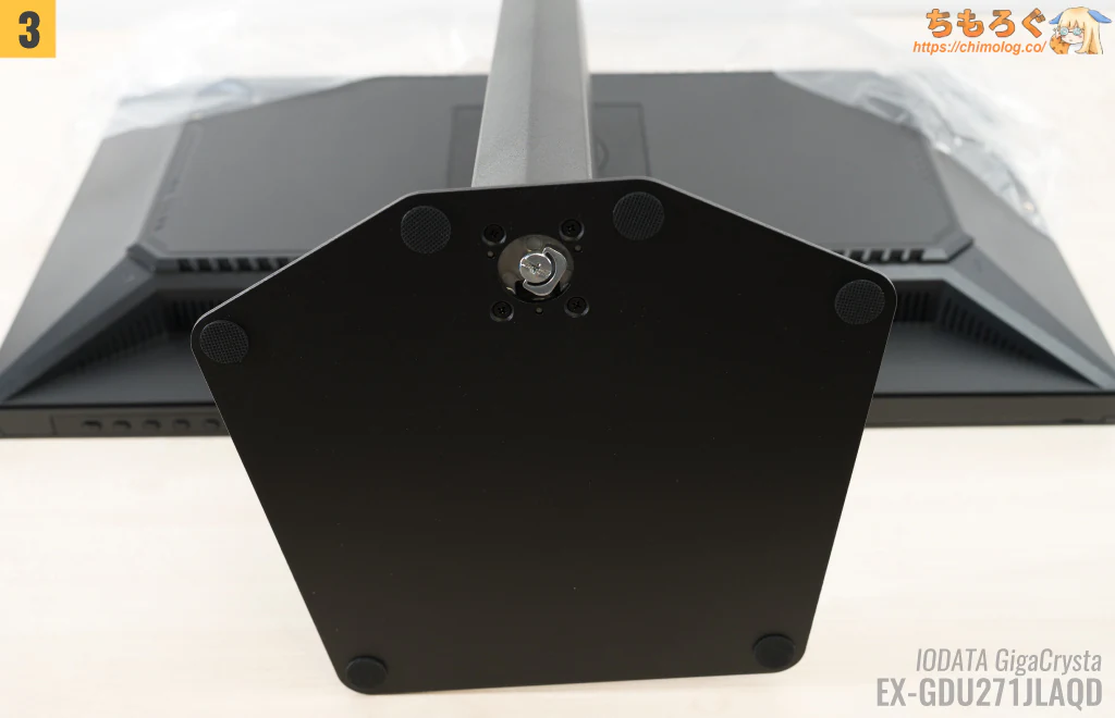 ゲーミングモニターで定番のドッキング方式です。プラスドライバーが不要なツールレス設計でかんたんに組み立てられます。