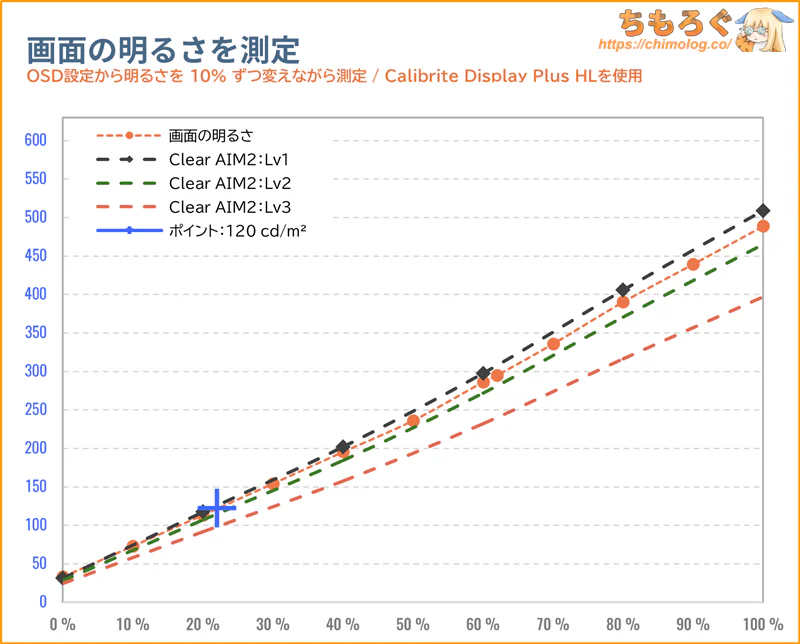 ※画面の明るさは好みに合わせて調整してください。明るさ74%で、筆者の好みな350 cd/m²に達します。