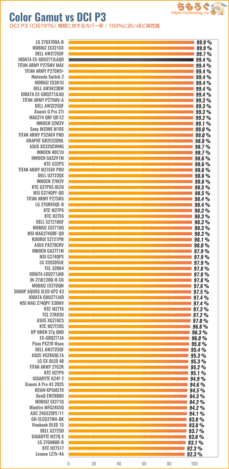 IODATA EX-GDU271JLAQDはハイエンドMini LED液晶らしい驚異的な色域を叩き出し、DCI P3色域とAdobeRGB色域どちらもほぼ完璧(約99%)にカバーします。