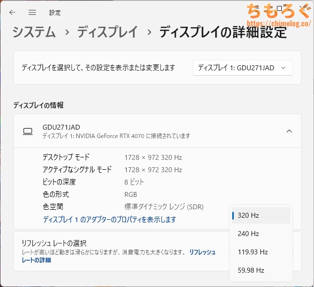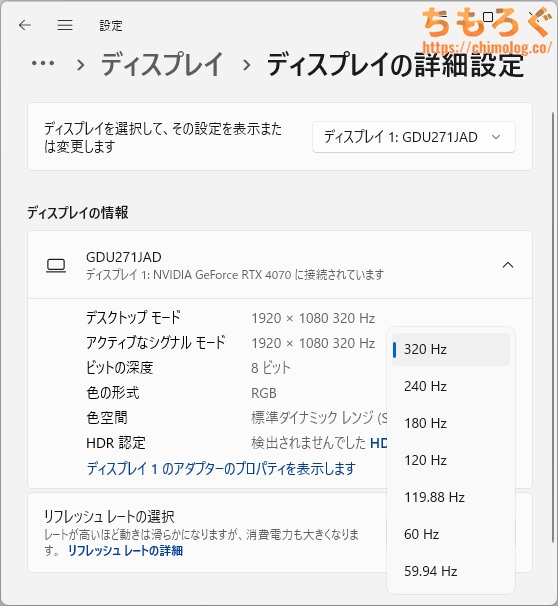 最大320 Hz対応で、応答速度がそこそこ速いです。ドットバイドットで24インチ表示も対応。