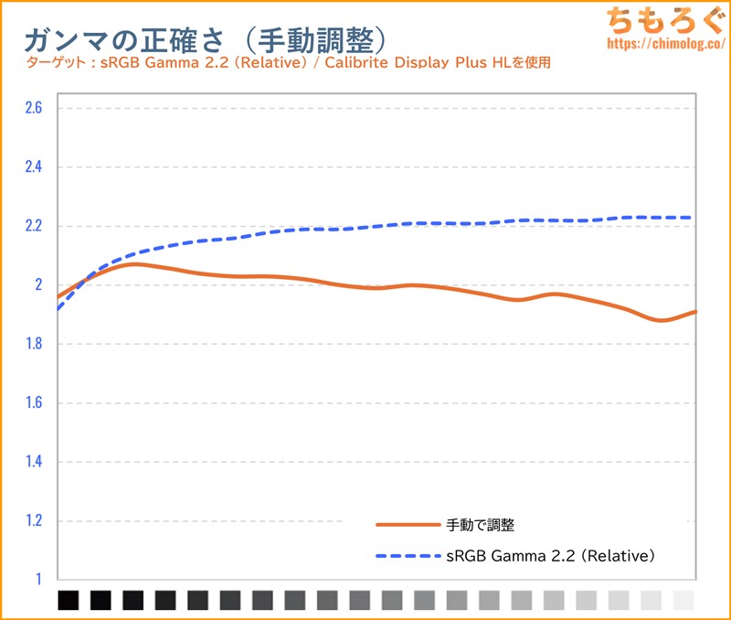 グレースケールはおおむね修正できましたが、ガンマカーブはどうやっても直せないです。明るい色ほどガンマが下がり続け、やや白っぽい仕上がりに調整されてます。