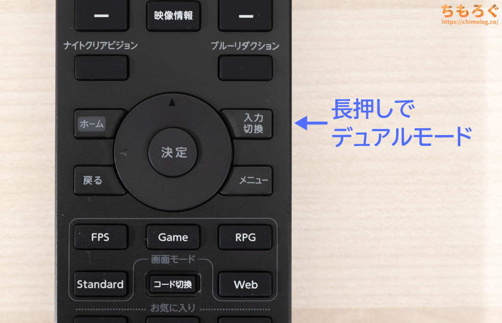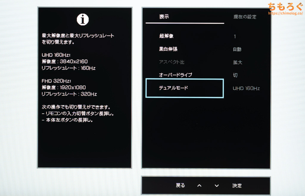 リモコンのボタンを長押しで二刀流モードに入ると、画面がフルHD表示に切り替わり、リフレッシュレートが160 → 320 Hzへ倍増して競技性を向上させます。