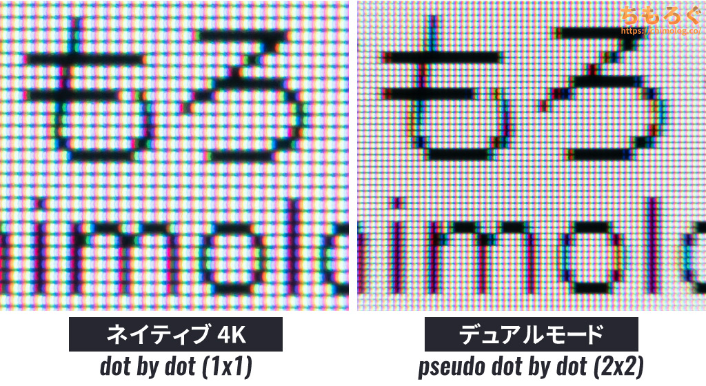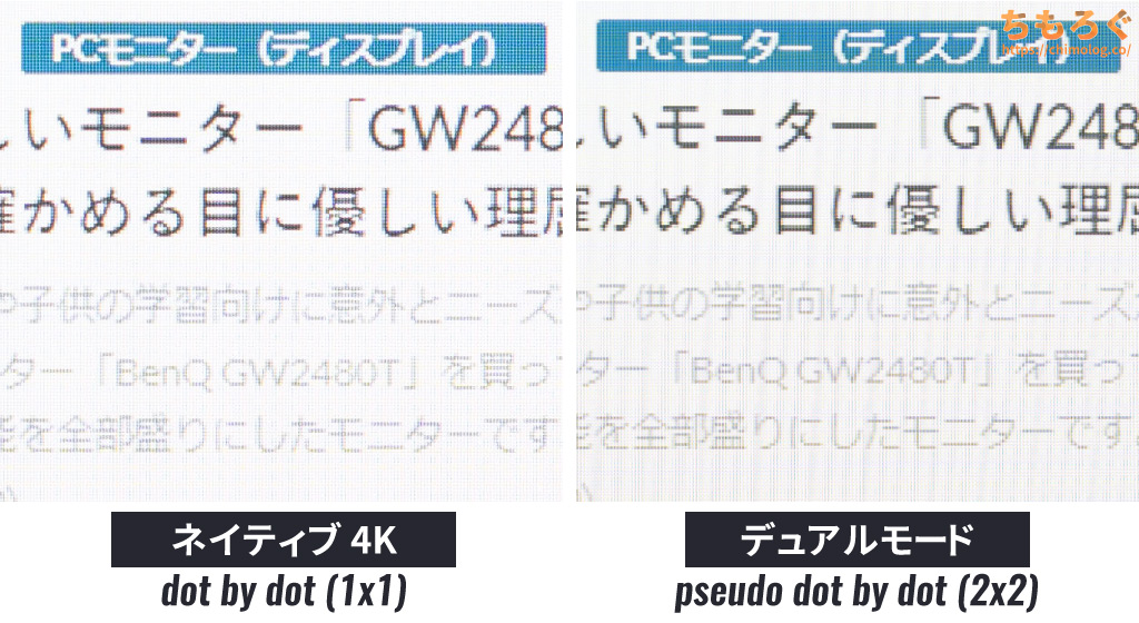 文字がそれなりにクッキリと見え、完全なフリッカーフリーに対応。4K解像度で作業性も優れます。ただし、「sRGB」モード未実装、パネルの反射加工も少々クセが強いです。
