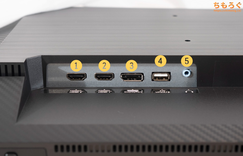 映像端子は全部で3つあり、HDMIポートが最大120~160 Hz(3840×2160)まで、DPポートも最大160 Hz(3840×2160)に対応します。