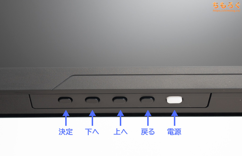 モニター本体の右側底面にある「物理ボタン(5個)」を使って、ちまちまとOSD設定を操作できます。とても面倒くさいです。