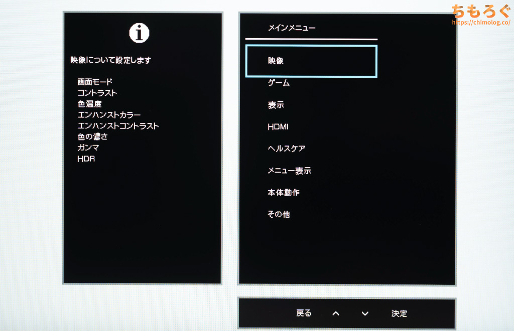 項目ごとに分かりやすく整理されたフォルダ階層型のOSDレイアウトを採用。ボタン操作ならレスポンスも良好です。