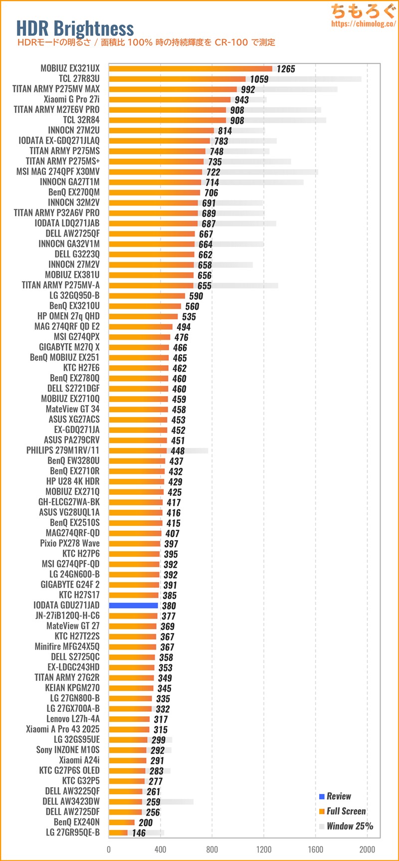 Display HDR 400認証すら合格できない、必要最低限ラインを下回る非力なHDR性能です。ピーク輝度が暗く、コントラスト比も伸びず、HDRコンテンツの再現性に乏しいです。