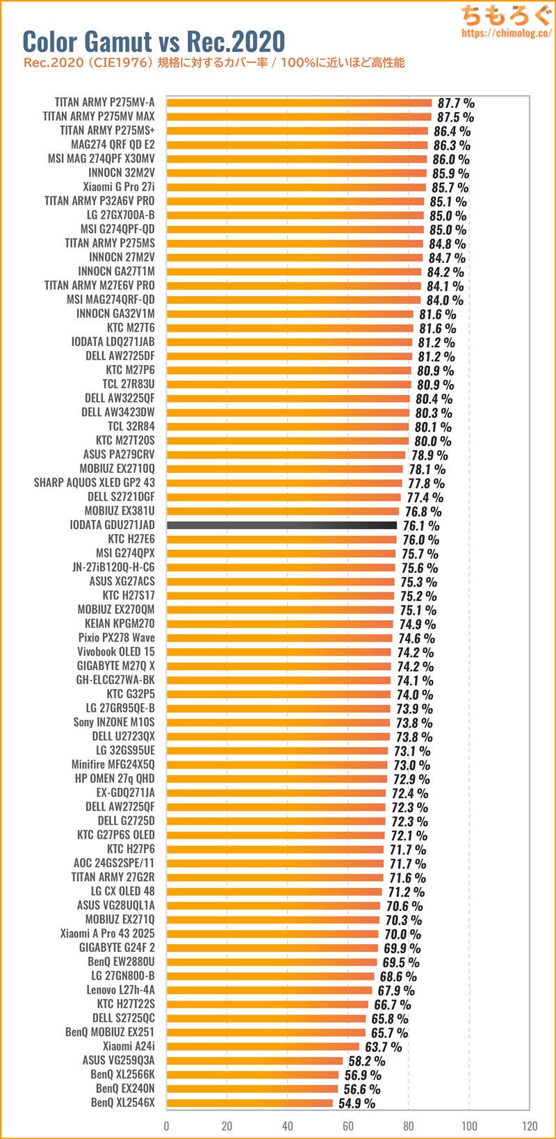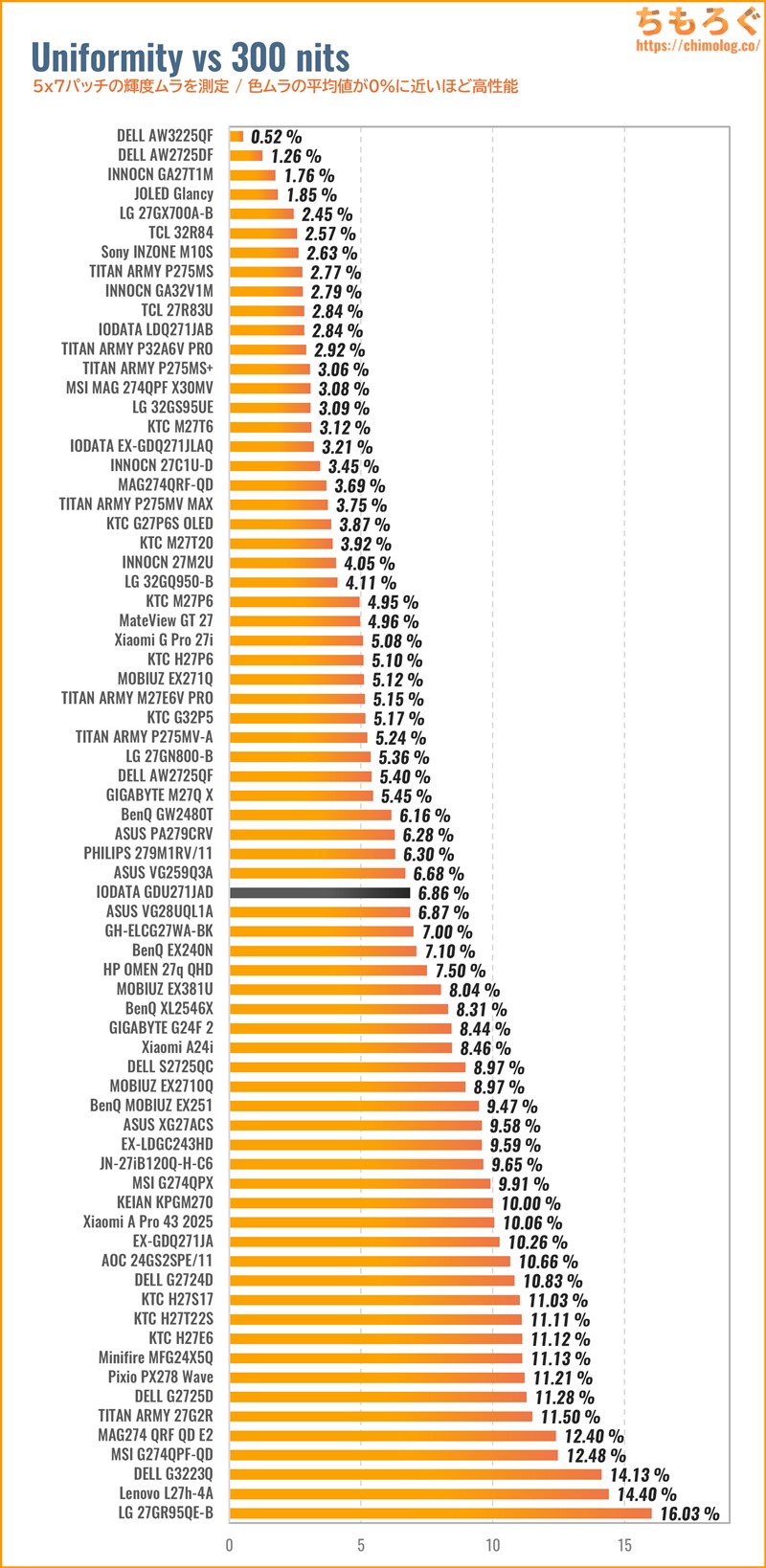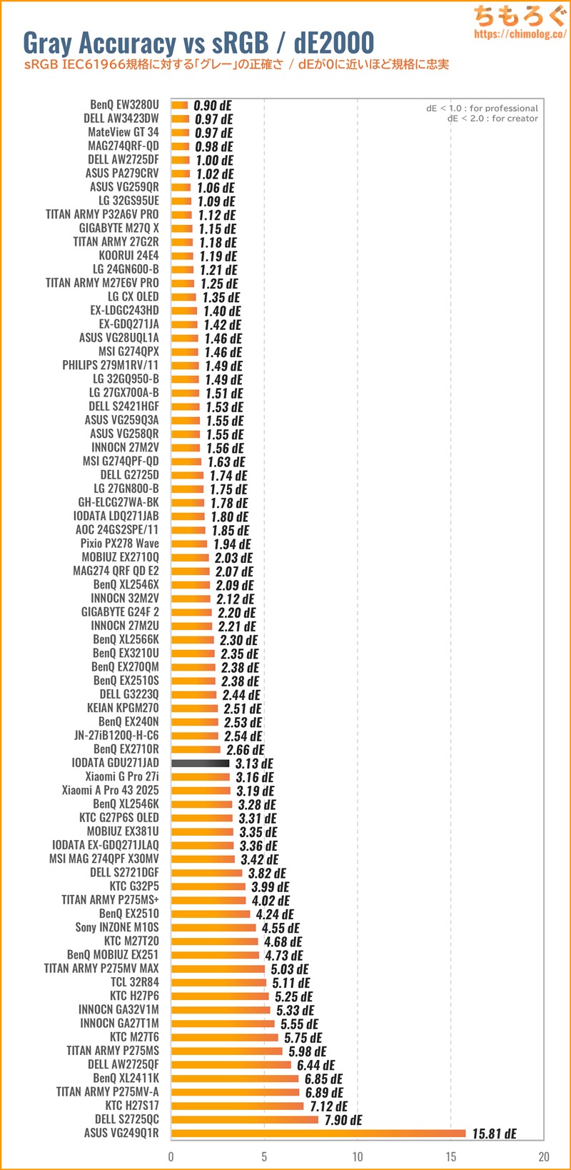 以前レビューした「GDQ271JLAQ」と同じ傾向です。なぜ、IODATAがガンマカーブを下げ続ける色合いを好むのか・・・よく分からないです。