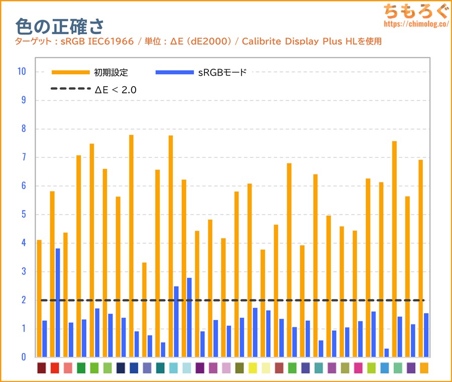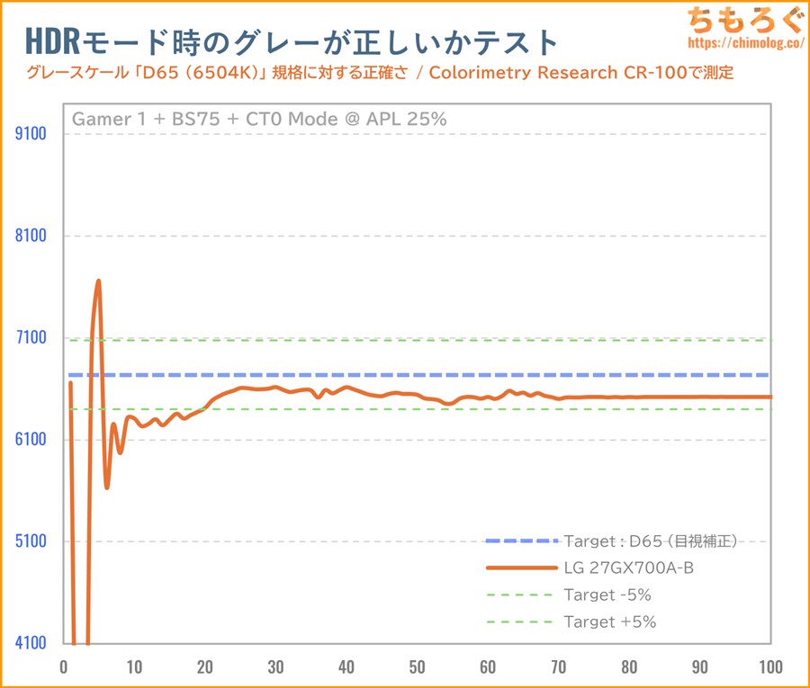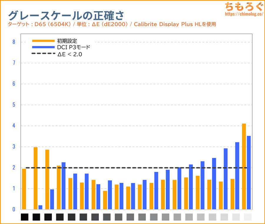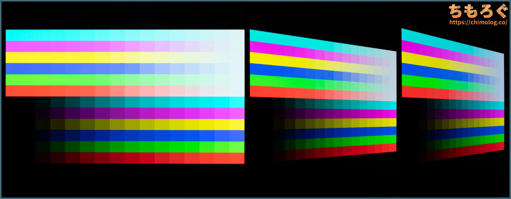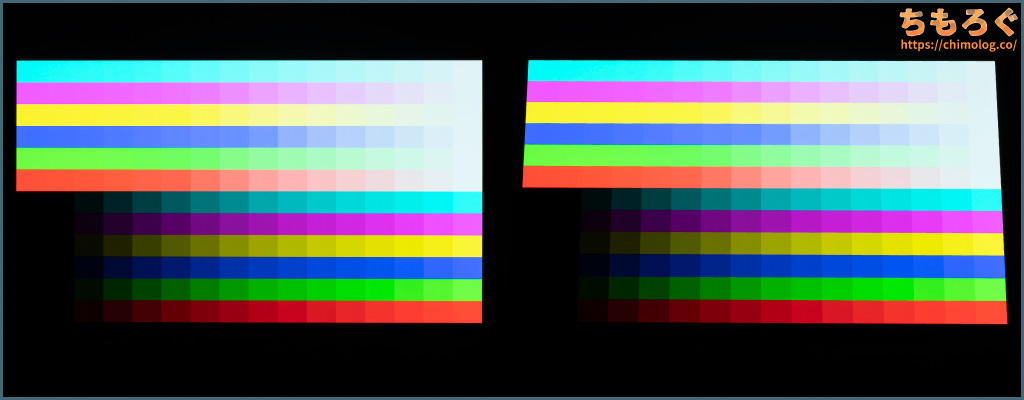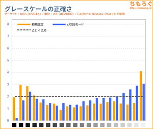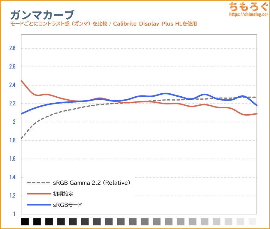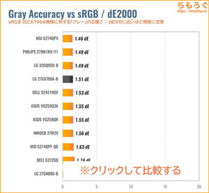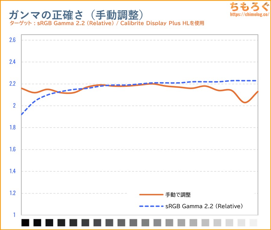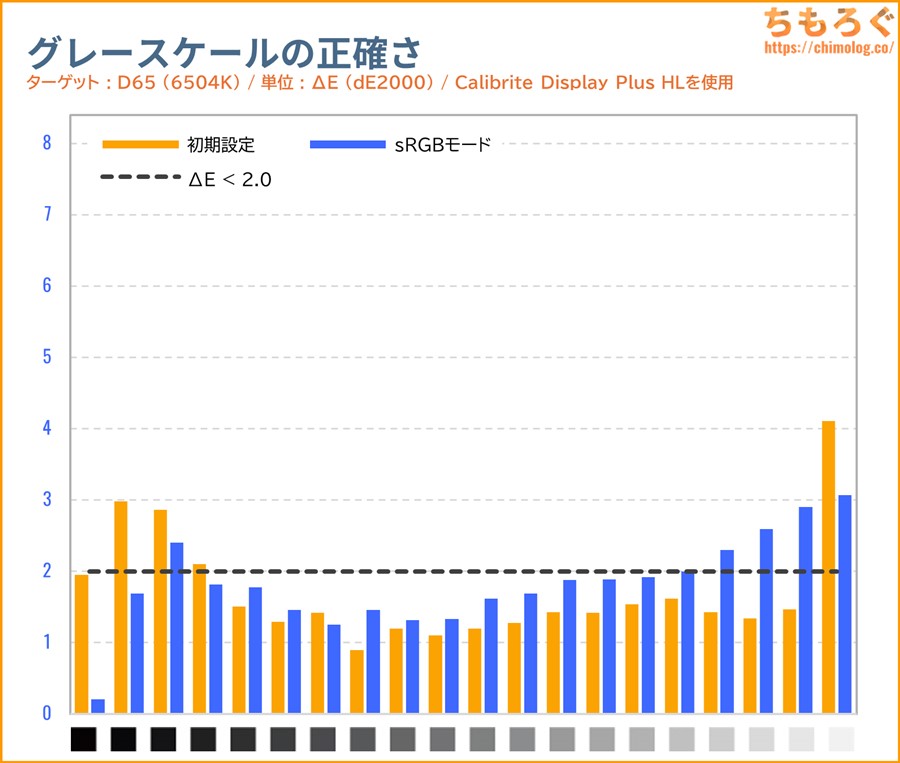 LGは代替ホワイトポイントを使って出荷時校正するから、最初から割とグレーが合っていて助かります。sRGBリファレンスモニターが無くても調整しやすいでしょう。