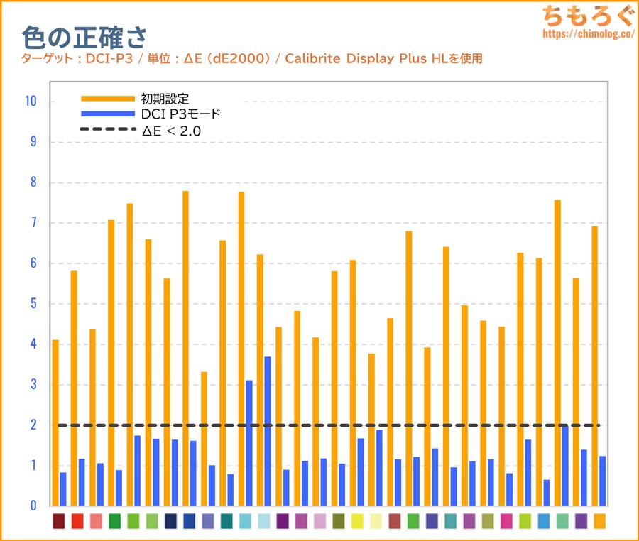 プロの写真編集や動画編集に耐えうる広大な色域と輝度を備え、ほぼ正確(ΔE < 2.0)な「DCI P3」モードが用意されています。しかし、「Adobe RGB」モードはありません。自分でキャリブレーションが必要です。