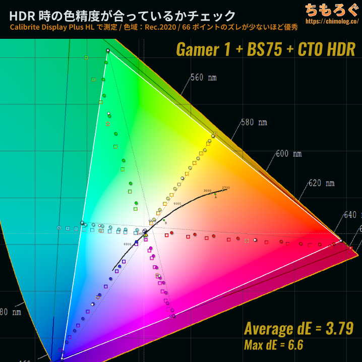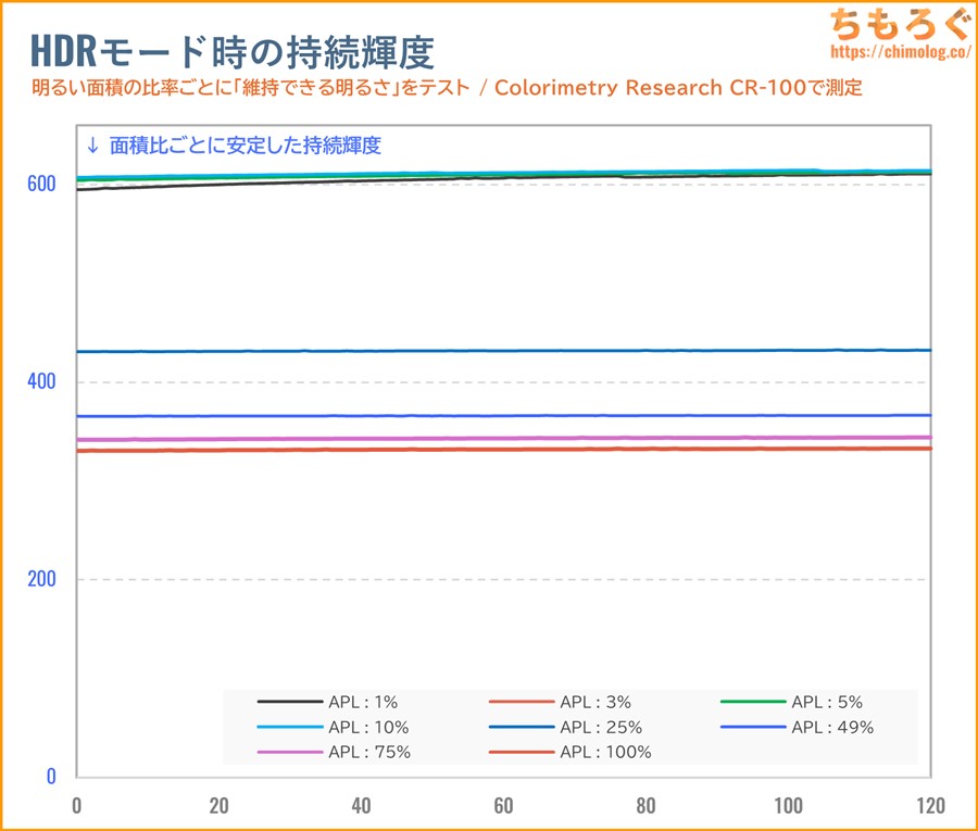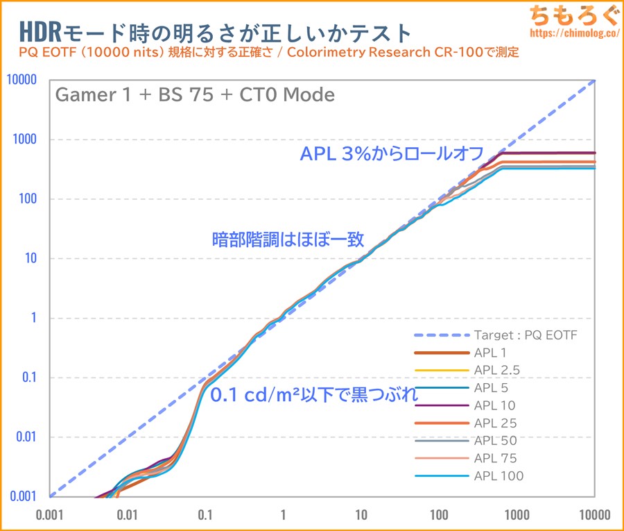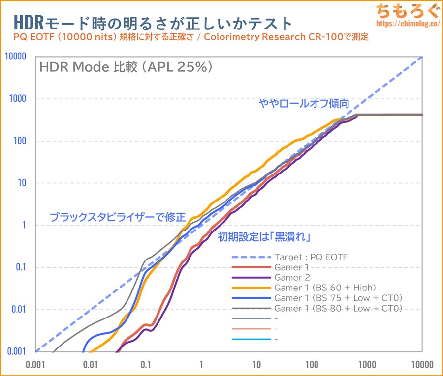 Display HDR True Black 500認証に合格できる性能です。OLEDモニターとして過去もっとも明るく、輝度の安定性も優れます。HDRモード時の明るさ(PQ EOTF)精度は及第点ですが、ブラックスタビライザー機能を調整すれば、黒潰れをかなり修正できました。HDR 600クラスの明るさと、無限のコントラスト比が両立し、明暗差の大きいHDRを楽しめます。なお、ピーク輝度と精度はまだまだ改善の余地あり。
