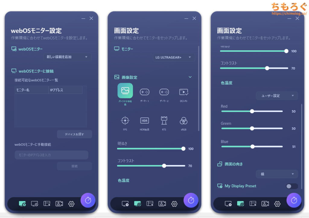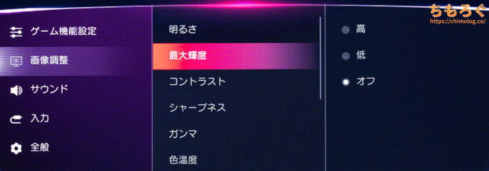 輝度、色温度、ガンマもスライダーを動かして自由に選択可能。