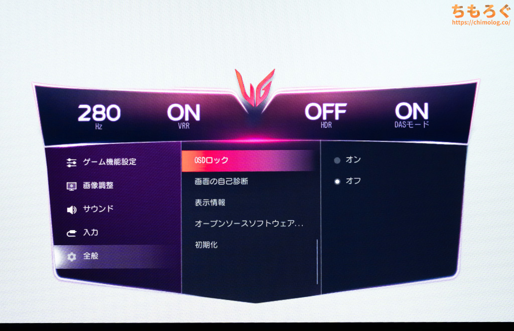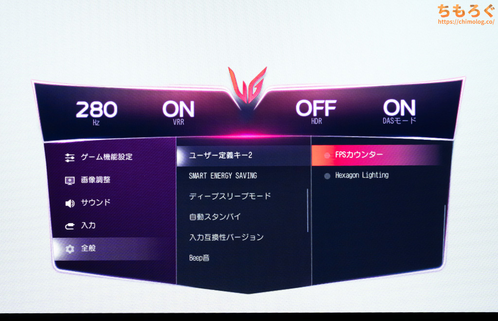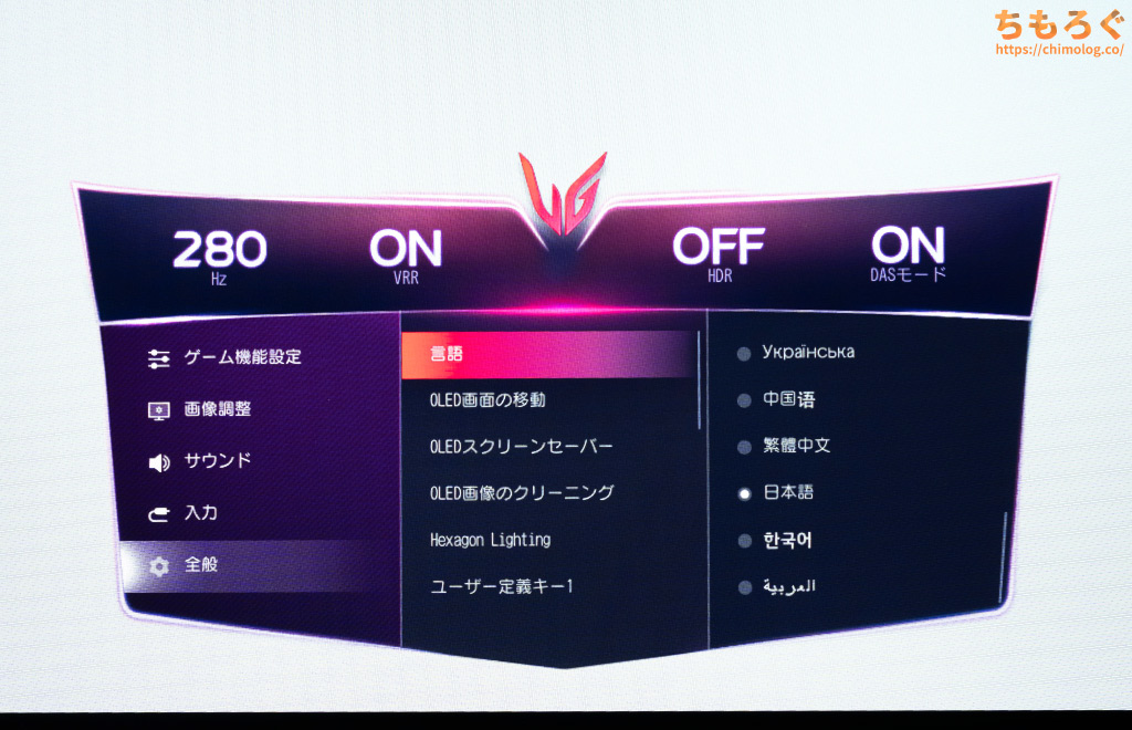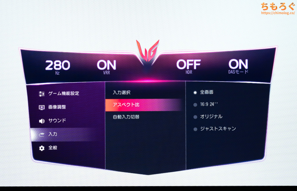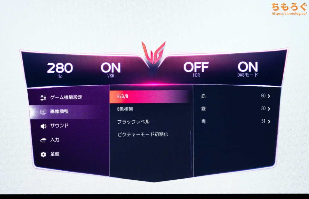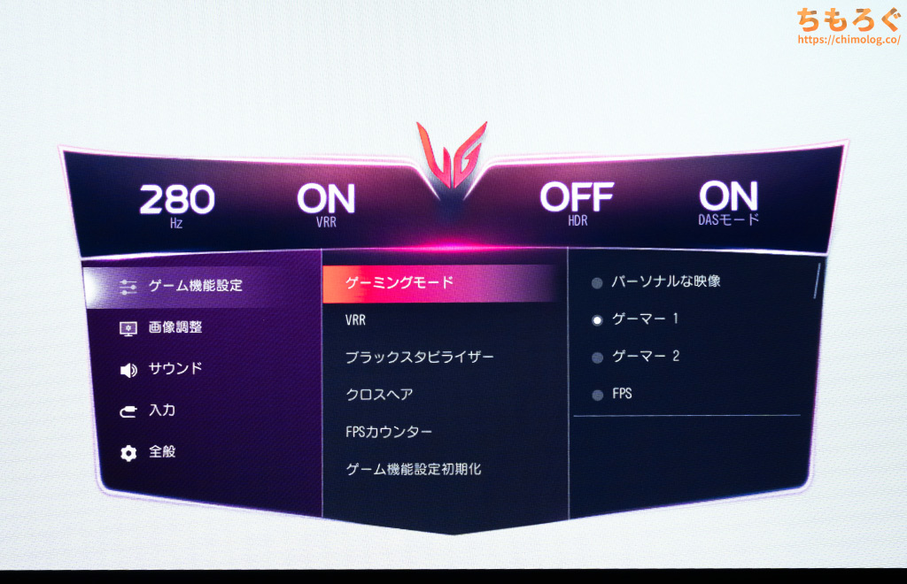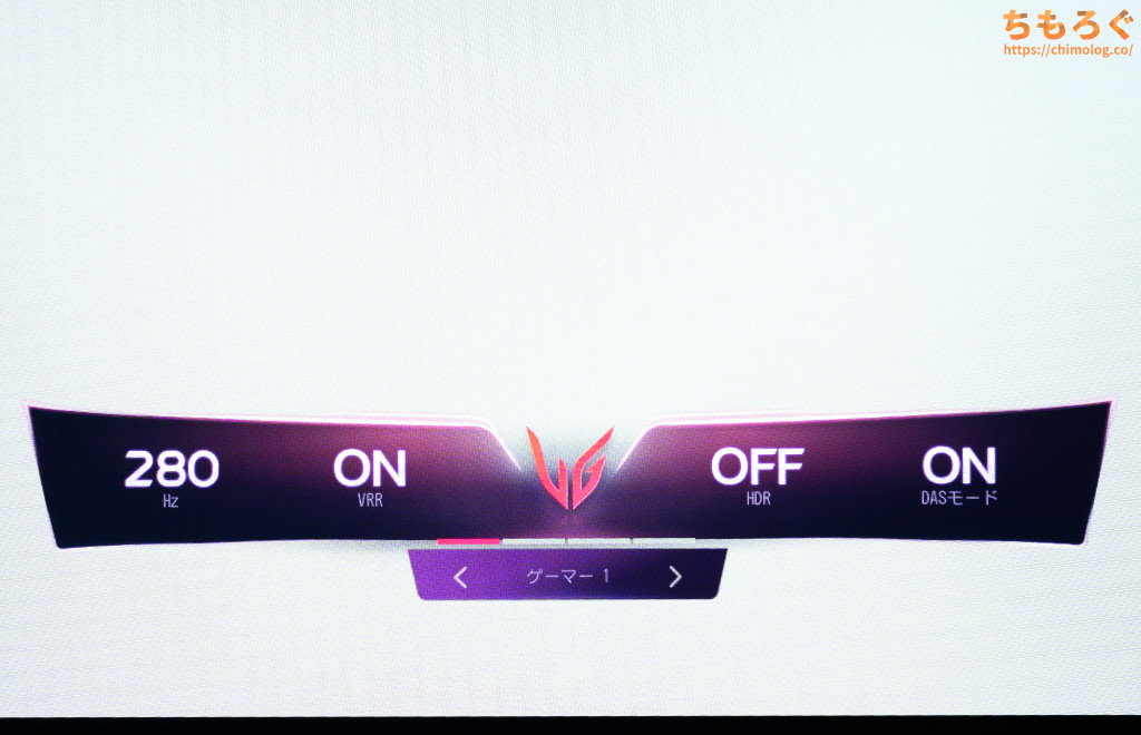 最大280 Hzで応答速度も最速クラス(0.21ミリ秒)です。競技ゲームで気になるかもしれない「ピクセルシフト」も設定で無効化できます。