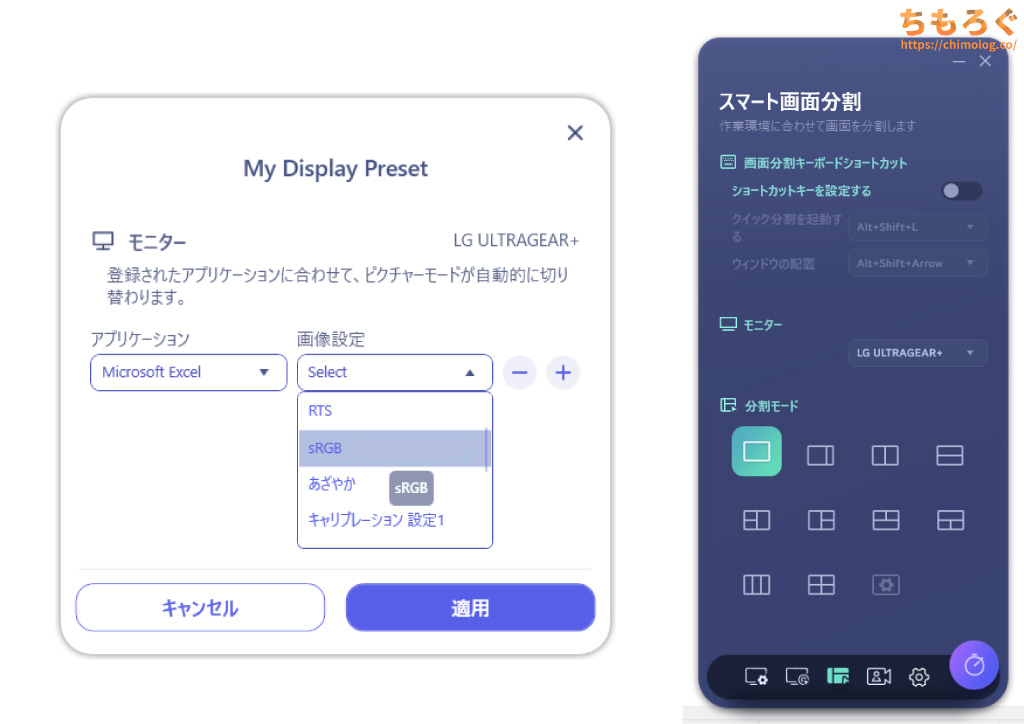 OSDソフトから、プリセットの切り替え、画面の明るさ変更、画面分割(PIP)の設定のほか。起動するアプリに応じて自動でカラープリセットを割り当てる機能もあります。