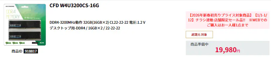 DDR4メモリ(DDR4-3200 / 容量16 GB)も同時に特価です。
