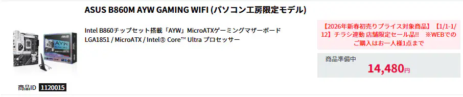 不人気で価格がどんどん下がっている「Core Ultra 200S」で格安自作なら、ちょうどASUS AYW GAMINGが特価の予定にあがっています。
