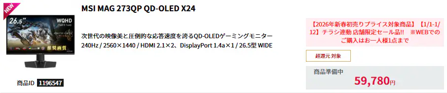 - MAG 273QP QD-OLED X24:約6万円(-4万円)