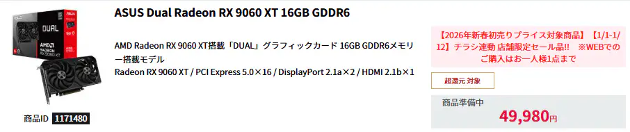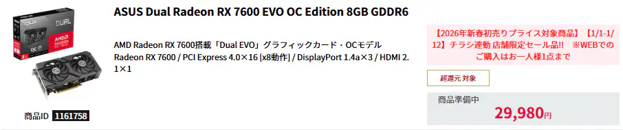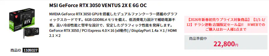 とりあえずフルHDでゲームが動けば文句がないレベルなら、2万円台の大特価セールが予定されている「RX 7600」や「RTX 3050」が候補です。