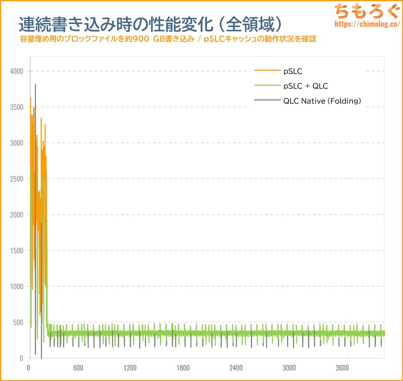 pSLCキャッシュが瞬間的に切れる挙動を定期的に繰り返しつつ、平均的にはテスト終了までずっと混合モードをほぼ途切れず維持します。