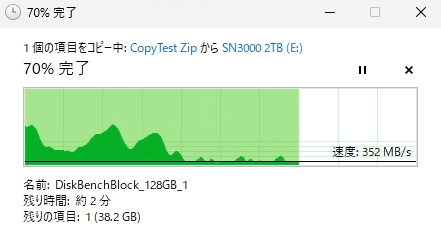 60~70 GB程度のpSLCキャッシュ展開にとどまり、枯渇すると平均350 MB/sに落ち込みます。
