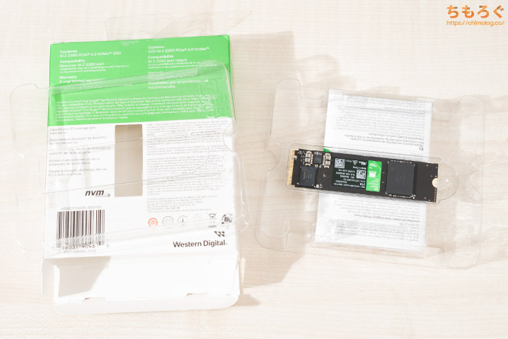SSD本体が、プラスチック製の透明ブリスターパックに収納されています。