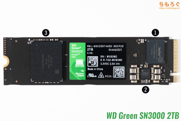 WD Green SN3000は、主に3つの部品で構成されます。筆者が分かる範囲で、部品の詳細を1つずつ確認します。