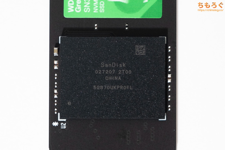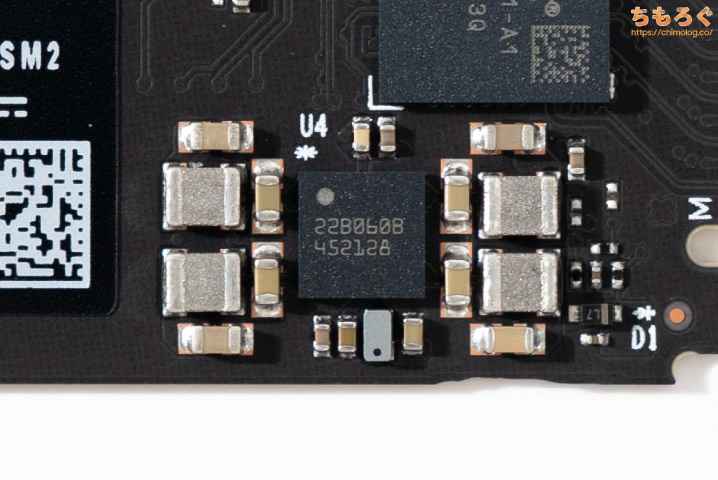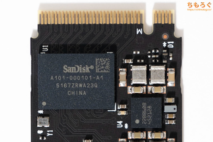 電源管理コントローラ(PMIC)も詳細不明ですが、刻印「228060B」は、歴代のSanDisk SNシリーズで同様に確認されています。